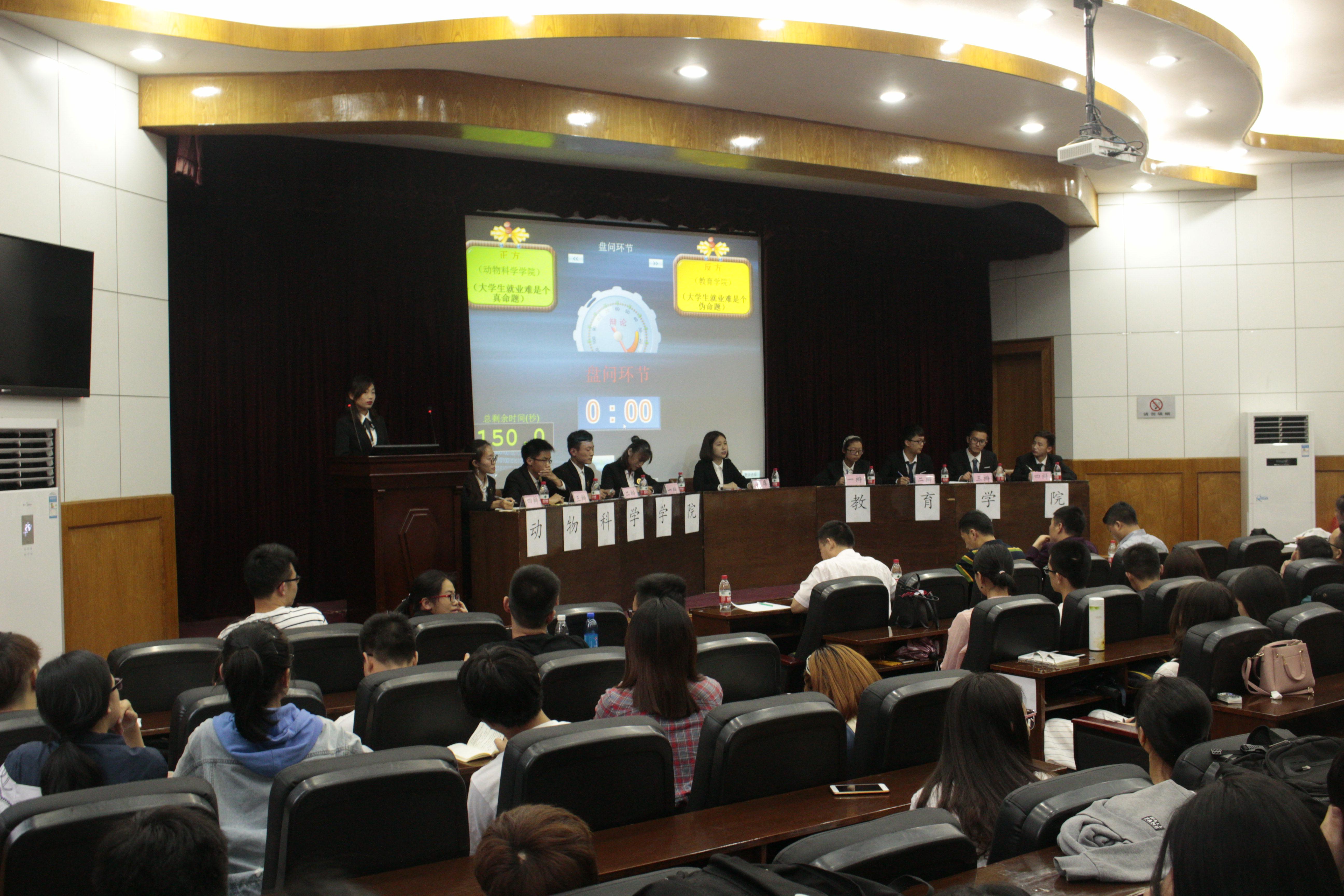比赛伊始,正方动物科学学院代表队,开篇立论,认为大学生就业难是真命题,并从“大学生因为自生能力达不到应有水平;对社会认知缺乏导致就业困难”等两个方面进行论述。反方教育学院代表队则表示“错误的认识是造成大学生形成就业难这一刻板印象的原因,大学生的特质决定了其又有着由于其他群体就业的显著优势,中国社会发展变革也为其就业提供了有利条件”。