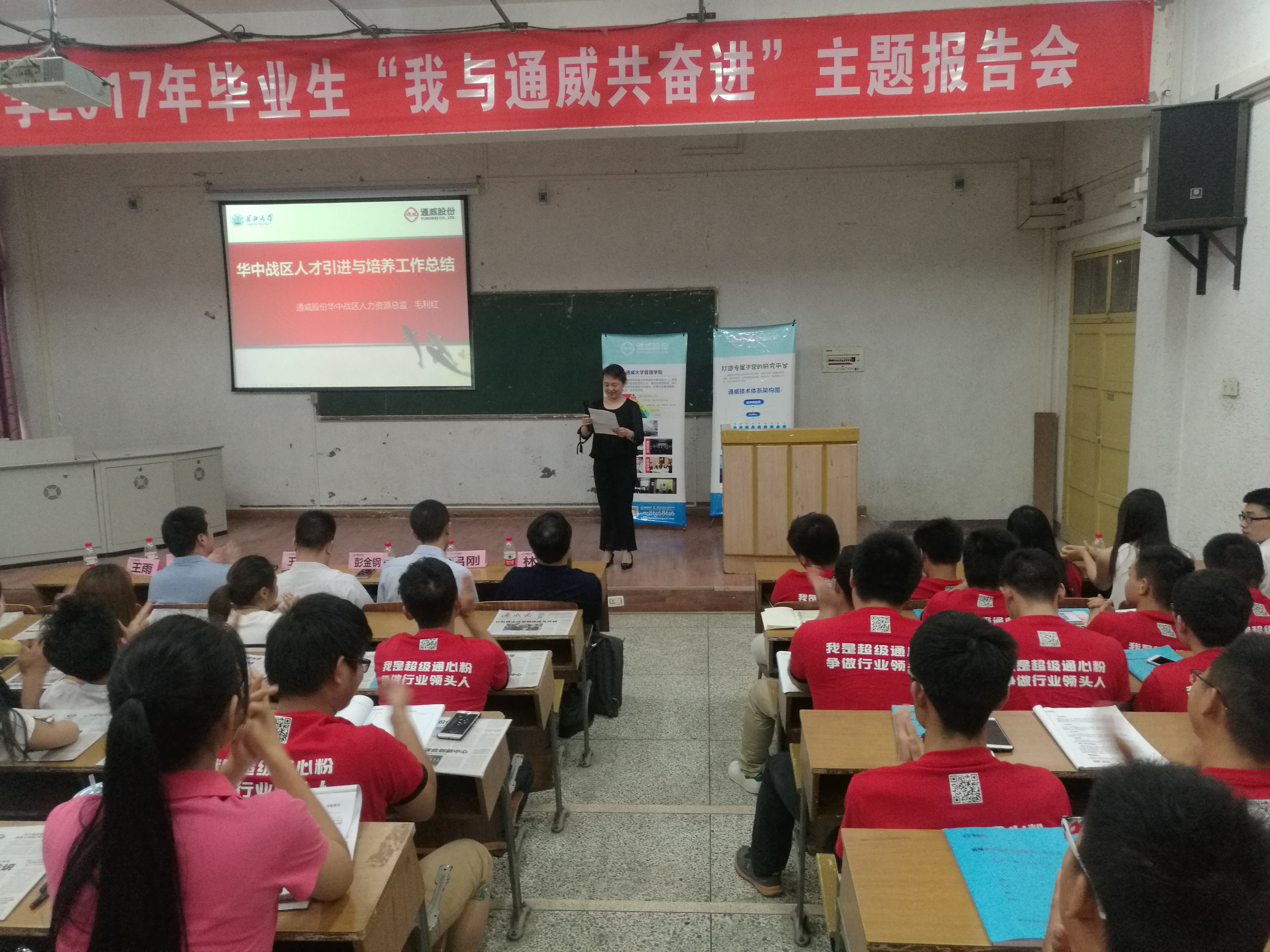 (通讯员 余平杨秋凤) 校企合作,共育英才。5月20日下午2时许,英国上市365官网2017年毕业生“我与通威共奋进”主题报告会在五教203顺利举行,出席此次大会的有动科院党委书记王凌华、党委副书记王雨、通威集团华中片区畜禽技术总监吕刚、华中片区人力资源总监毛利红、武汉通威饲料有限公司总经理彭金刚、沙市通威总经理林涛,英国上市365官网200多名学生参加了报告会。