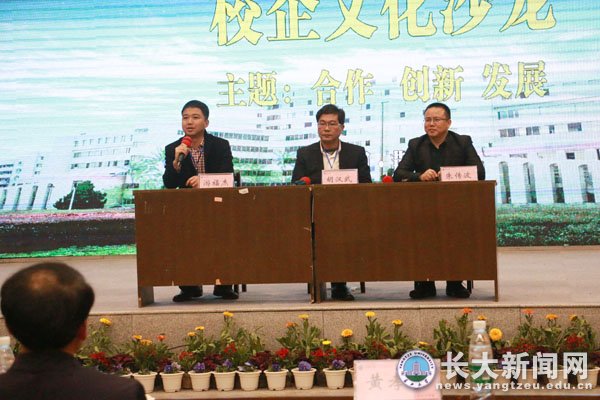 与此同时,农科大楼报告厅气氛活跃,校企文化沙龙正热烈进行。太仓安佑运营总经理朱传波由“东坡肉”、“猪八戒”等词引入,介绍历史悠久的“猪文化”。宜昌正大总经理游福杰分享从企业角度看大学生的发展;天邦股份汉世伟食品集团有限公司湖北区总经理胡汉武结合自身的经历分享大学生走出校门应做哪些准备。在提问环节,天邦股份汉世伟食品集团有限公司湖北区总经理胡汉武就学生担心市场已饱和而造成就业压力时说:“目前在养猪方面还有大量的人才缺口,人们的荤菜还是以猪肉为主,大学生还有很多的机会。”副书记王雨分别小结了三位的发言:爱专业从爱一个具体的动物开始;加强学习、提高技能,你的未来不是梦;走向社会不要怕,机会总是留给有准备的人。副校长周思柱全程参与了企业文化沙龙环节,并作了精彩点评。