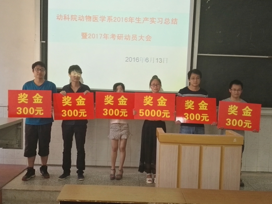 汪招雄博士首先解读了我校关于大四学生推免研究生的相关政策和英国365官网对参加研究生考试以及获得研究生入学资格的奖励政策,然后宣读了动医动药专业2016年考研的10名学生表彰名单(张小婷、蔡萌、周晶谦、李端端、徐闰、王咏、王彪雄、文继锋、黄安雄、张友),许巧情副院长向优秀研究生代表颁发了奖励,同时对这些同学提出希冀,望再接再厉,积极进取。之后,许巧情副院长发表动员讲话,她给学生提出了16个字:耐心分析,量力而为,认真备考,坚持到底。并与同学们分享备考经验指出要坚定决心,相信自己,在学习过程中要甘于寂寞,建立良好的团队学习模式。在学习的同时还要劳逸结合。介绍了英国365官网研究生设有国家奖学金、助学金、以及学业奖学金。报考英国上市365官网的研究生的奖学金覆盖率达100%,平均每人每年可领取8000元,考生不用为学费而担心。