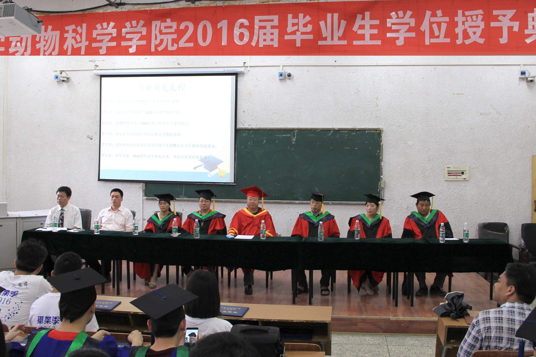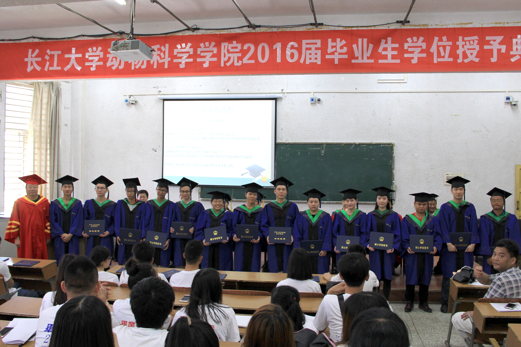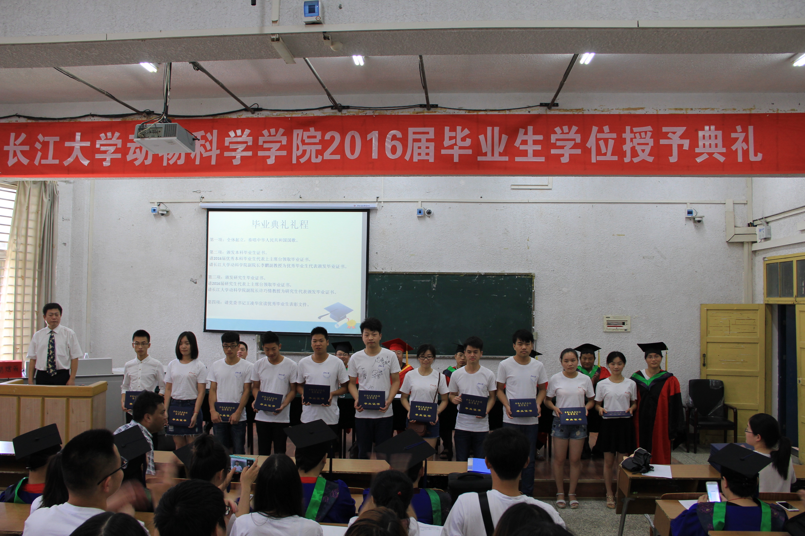 6月14日上午10时,英国365官网2016届毕业生毕业典礼暨学位授予仪式在5教203教室隆重举行。院长杨玉莹、党委书记王凌华、副院长许巧情、党委副书记王雨、水产系主任柴毅、动医系主任杨丰利、动科系主任杨烨、学工办主任李则俊、原辅导员靳恒及部分毕业班班主任出席了毕业典礼和学位授予仪式。典礼由党委副书记王雨主持。