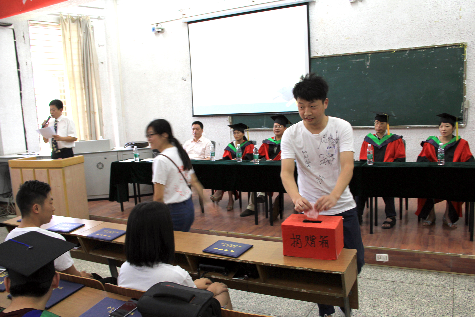 毕业生代表捐赠教育发展基金。典礼倡议全体毕业生在自身发展的同时,不忘母校的教育和发展,确定班级校友联络员,实时反馈校友动态。