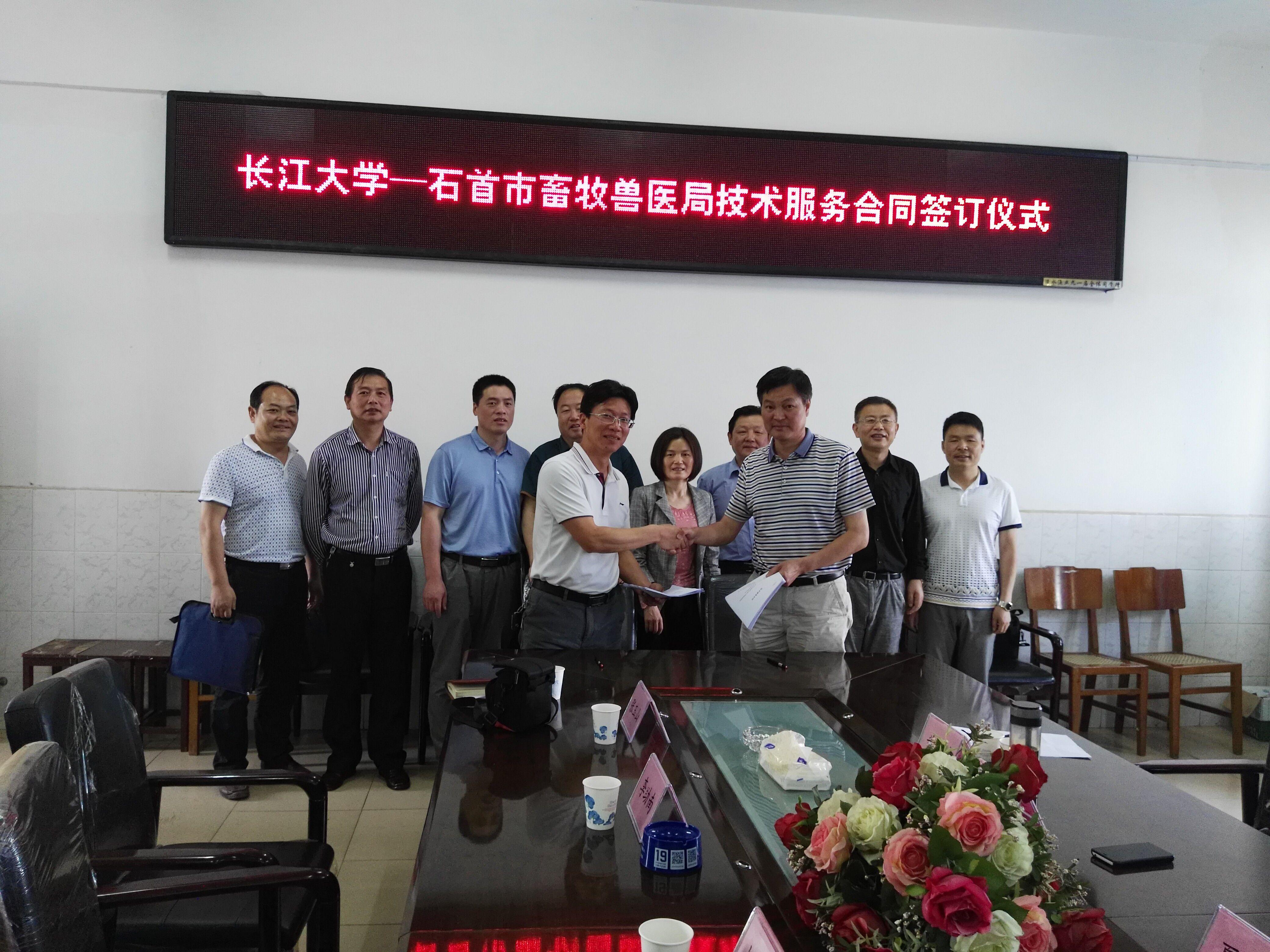 5月18日下午4点西校区动物科学学院会议室,英国365官网与石首市畜牧兽医局关于《石首市畜禽养殖区域规划制定》技术服务合同的签字仪式隆重举行。