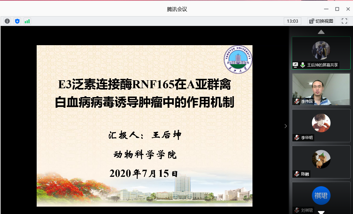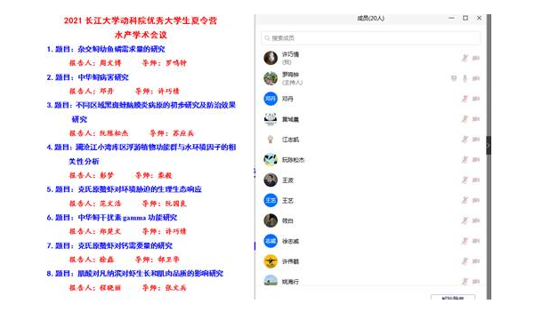 7月15日下午水产养殖学专业在罗鸣钟系主任组织下,周文博等8位研究生纷纷宣讲了自己目前研究取得的成果,网上学生讨论热烈。随后水产系老师和线上学生进行了深入的交流。