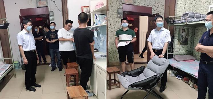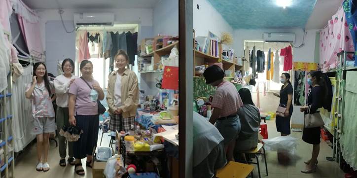 老师们对各个年级的宿舍进行逐一走访,在检查宿舍卫生的同时,仔细询问了学生的心理和身体健康状况。老师们要求学生每天按时进行体温监测并及时汇报,确保下周线下教学的顺利开展,叮嘱学生们勤洗手,多通风。在宿舍走访中,熊新山与同学们进行了亲切的交流,希望同学们珍惜校园学习时光,不要沉迷于电子游戏,认真准备四、六级英语考试。鼓励同学们及时调整心态,尽快进入学习状态,以积极的姿态迎接新学期的校园学习生活。