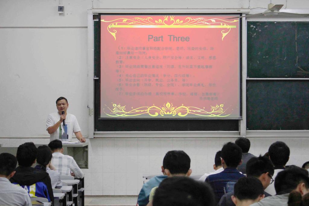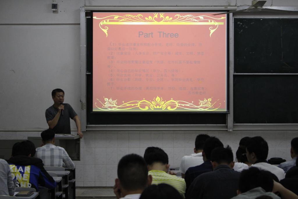 接着齐书荣老师从安全、毕业聚会、毕业合影及毕业情况进行了说明,毕业在即,齐老师希望同学们可以顺利的愉快的带着四年的美好回忆离开。最后王雨书记总结了前两位老师的讲话,将重要事宜重申了一遍。