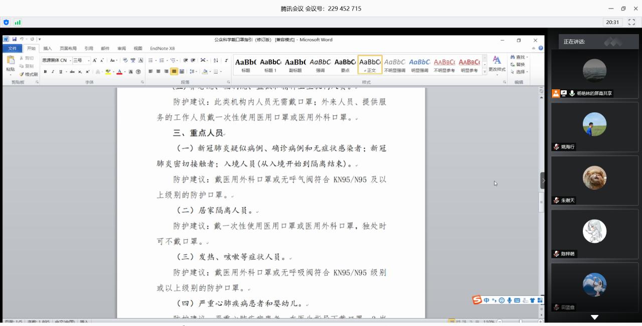 主题班会以学习《公众科学戴口罩指引(修订版)》和《夏季空调运行管理与使用指引(修订版)》,以及教育部应对疫情工作领导小组办公室委托北京大学、中南大学组织全国相关机构和学校,编写的《高等学校新型冠状病毒肺炎防控指南》为主要内容。会议向学生讲解了在新冠肺炎疫情低风险地区,不同人群、不同场所应如何科学戴口罩,以及戴口罩的注意事项,有效防控新冠肺炎疫情发生,保护公众健康。
