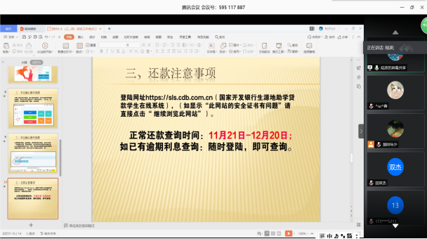 三年级与毕业年级开展诚信还款、诚信就业专题工作培训。通过集中培训深入宣讲生源地贷款还款流程、毕业生毕业确认等贷后管理工作。在生源地贷款还款培训会上,陆波老师结合英国365官网学生贷款的实际情况,为同学们详解介绍了资助政策、毕业确定操作指南、还款注意事项、提前还款、个人信息变更和个人征信问题等具体事宜,并就采取何种方式还款、何时还款、诚信还款等给予了诸多建议并现场解答了部分学生提出的问题,让参会的每一位同学对生源地贷款还款的流程和注意事项有了更全面、更深刻的了解。