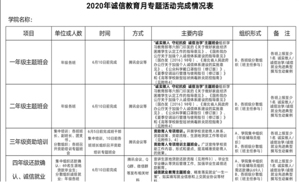 活动以“诚信教育”为主题,一、二年级通过腾讯会议开展“诚实做人、守纪抗疫、诚信治学”主题班会,以演讲、ppt讲解等多种形式组织学习教育部等六部门印发的《国务院办公厅关于加强个人诚信体系建设的指导意见》、《高等学校新型冠状病毒肺炎防控指南》等相关文件,引导学生在学习生活中宣扬诚信、践行诚信。三年级开展资助育人专项培训,通过腾讯会议和qq群学习了解了资助育人体系、资助政策和流程、生源地贷款的相关政策。