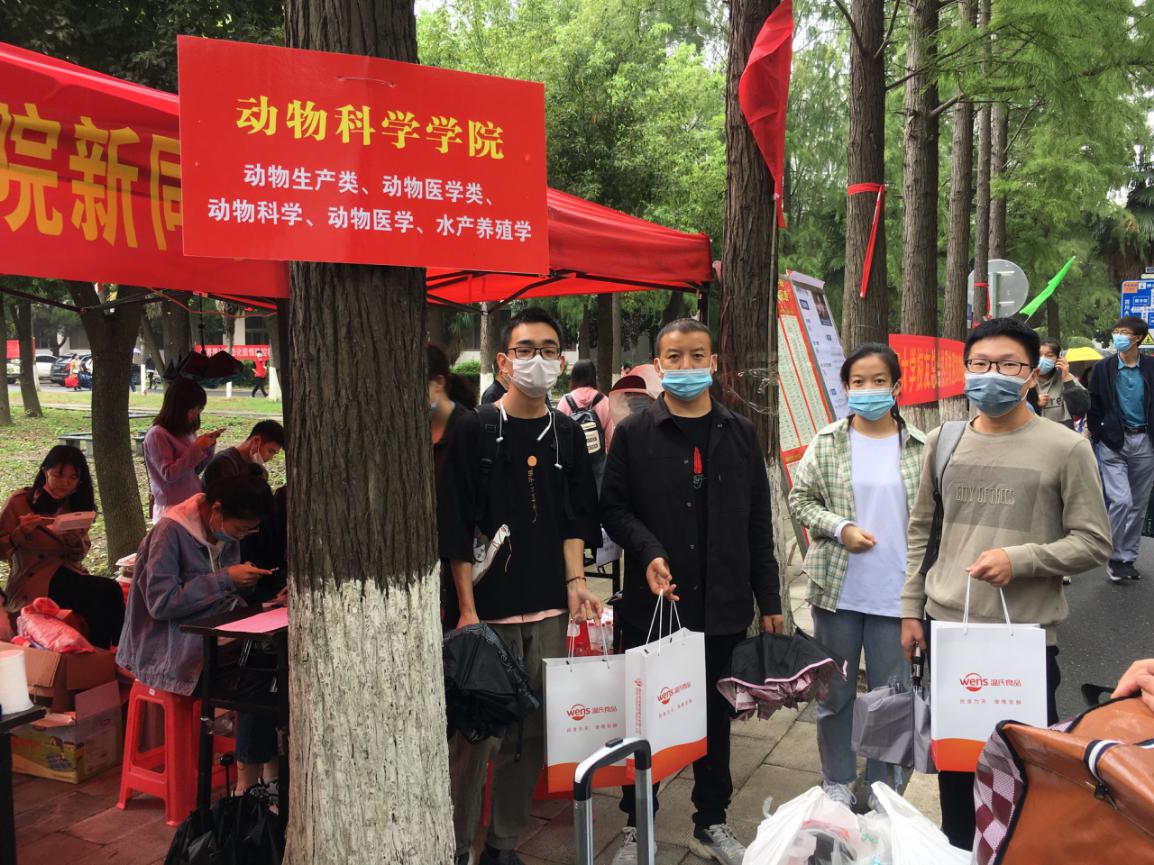 据了解今年动物科学学院2020级每一位报到学生都能领取到学院和企业共同为新生定制的“开学大礼包”,其中既有辅导员陆波老师为新生准备的现场报到程序单、校园卡使用指南、2020级新生入学手册等,还有“温氏集团”为新生制作的专用手提袋,里面有牛奶、鸡蛋、鸡翅等熟食,也有印制企业寄语的钢笔,这些小礼品都是采用线上个性化定制,每一样都体现了专业特色,又具有实用性,新生们拿到大礼包时,他们的入学之旅就开始了。