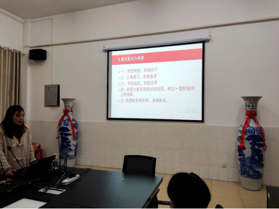 班长向讲述了英语四六级及期末考试诚信应考的相关规定并要求鼓励认真复习,严格自律,遵守国家和学校的考试规定,践行诚信考试的承诺,共同维护考试的公平与公正。在班会上,班长带领同学们认真宣读《诚信考试承诺书》。承诺自觉服从考试组织管理部门的统一安排,接受监考人员的管理、监督和检查;自觉遵守相关法律和考试纪律、考场规则,诚信考试,不作弊。