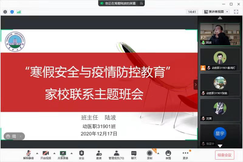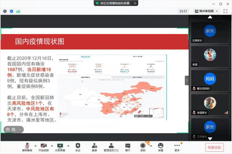 (通讯员:李灿阳 明正梁)为进一步加强假期安全防控,降低疫情反弹风险,落实假前学生安全教育工作。英国上市365官网各班级于12月16日晚7:00在腾讯会议召开寒假安全与疫情防控安全教育主题会议。学生家长参加了此次的会议。
