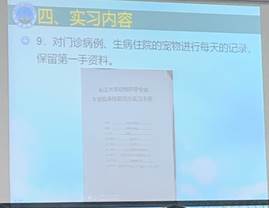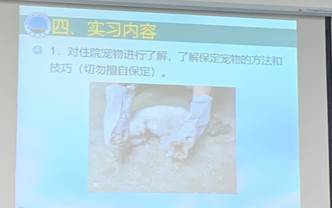 本科生需要前期对实习场地进行了解,观察学习研究生师兄、师姐完成日常清理工作,记录药物使用流程及摆放位置。在完成前期准备工作后,可以开展如“宠物体内外驱虫”、“注射”、“雾化”等专业实操训练实习,并观摩学习仪器设备使用及相关内容。