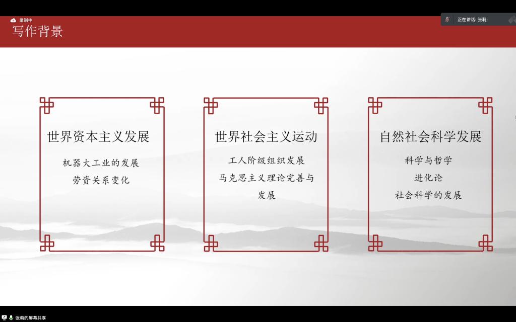 张老师就本书的写作缘源、写作背景、主要内容、核心理论分别做了详细的讲解。她表示,精读一本书之前,要先了解该书的写作背景和理论动机,她说道:“我习惯先看书本的序言和目录,序言可以帮助我了解作者的写作核心理论,也就是为什么写,目录则可以帮助我快速分析出整本书的写作框架和写作逻辑。除此之外,我还会主动去了解这本书形成时期的历史背景,从而更好的把握作者的思想感情。”