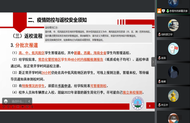 会议主要从返校前准备、疫情防控以及安全须知三方面展开,向同学们传达了学院秋季开学工作实施方案。会议上强调,在疫情形势严峻的情况下,非特殊情况不得提前返校,如有特殊情况及时与辅导员联系。处于疫情管控区的同学暂缓返校,会议上老师们要求同学要积极配合当地相关部门防疫工作,坚持健康打卡签到。学生报到实行“申请—审批”制,凭健康码绿码、行程码绿码、48小时核酸检测进行返校申请,非批准不到校。来校途中,如若发现身体不适或遇到突发事件,及时与学院取得联系。此外,学生到校后需主动开展健康状况监测,及时配合学校进行核酸检测。