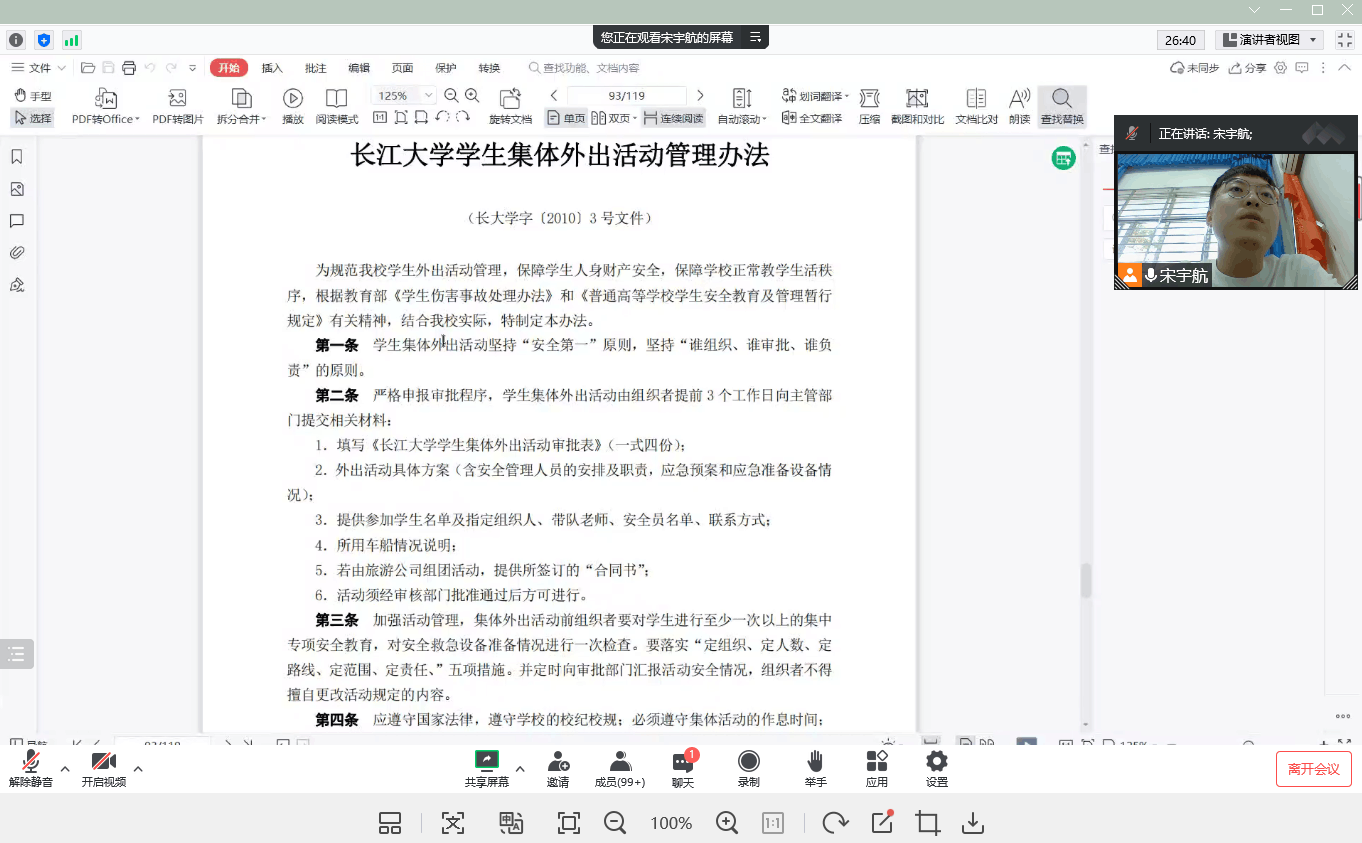 在培训的过程中,宋老师说道:“为提高我校新生安全意识,保障个人人身财产安全,保证学校正常教学生活秩序,提高学生思想水平与文化素养,本次入学教育将围绕学生手册、系列讲话与安全教育展开。”他表明疫情期间大家要严格遵守学校规章制度,如有违规,会有相应违纪处分。