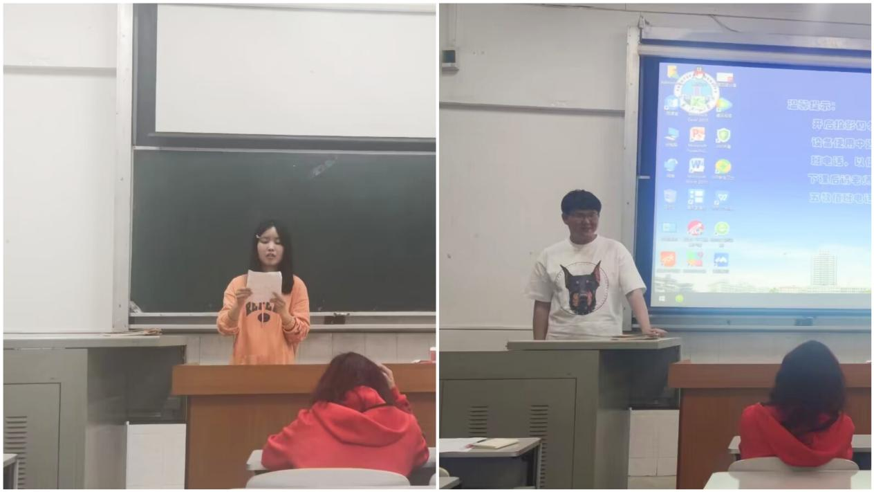 随后,21级学生代表孙浩文、范雅倩发言。他们从“单词、听力、作文”等方面分享了自身的考试经验,总结出若干复习技巧,呼吁低年级同学们坚定信心,按时参加早、晚自习。