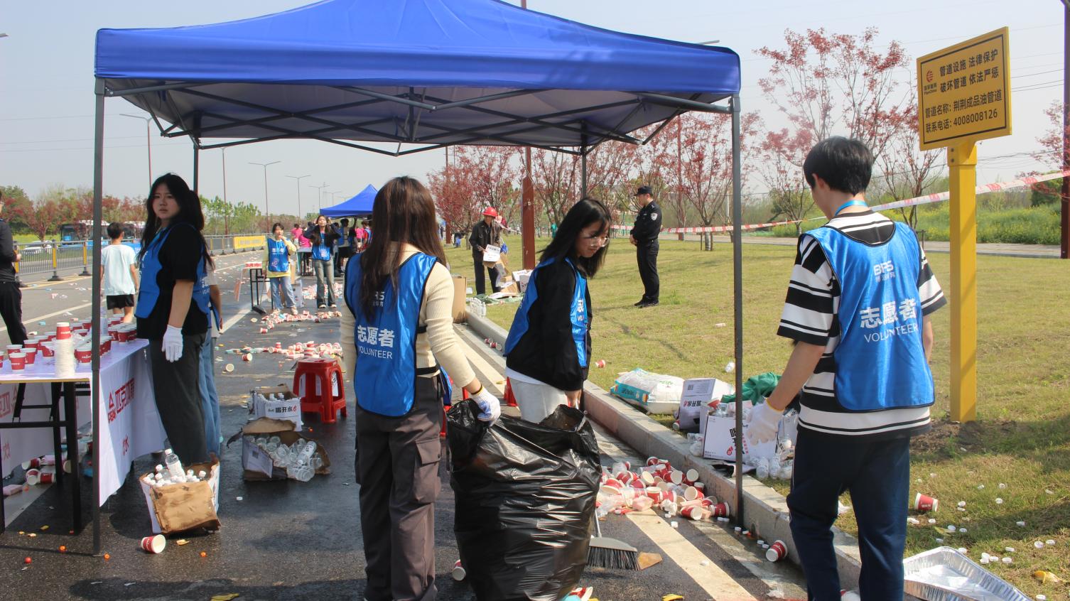 比赛结束后,志愿者们齐心协力,一起清理现场,确保赛道场地没有垃圾残留,保证了城市的干净整洁。